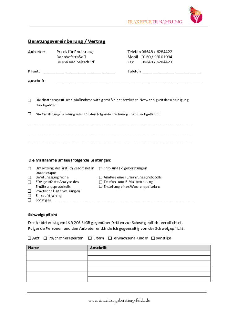PRAXISFRERNHRUNGBeratungsvereinbarung / Vert rag