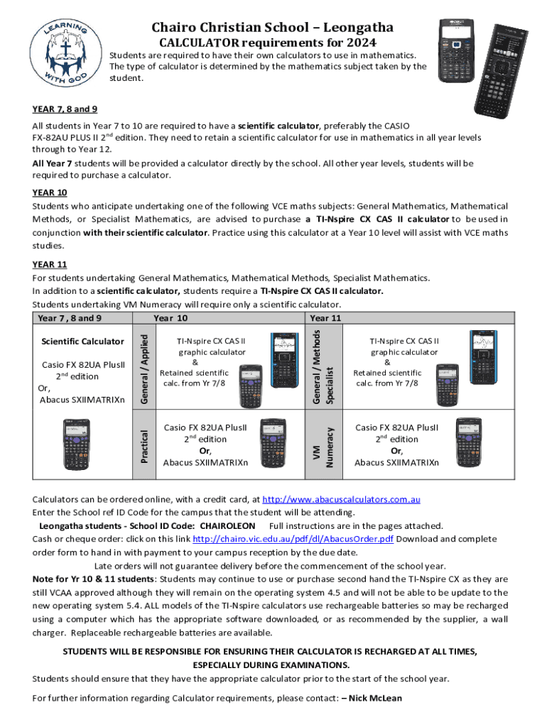 Chair Christian School Length CALCULATOR requirements for 2024Students are required to have their own calculators to use in mathematics. The type of calculator is determined by the mathematics subject