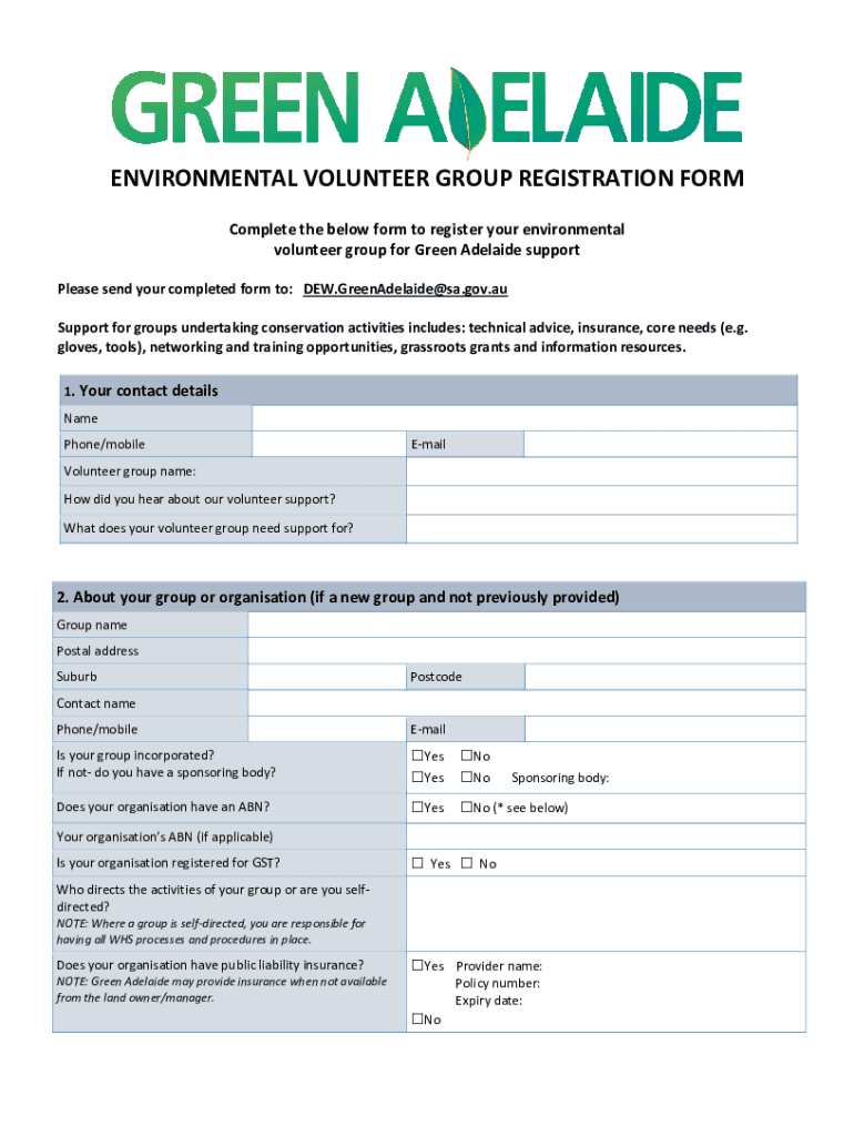 ENVIRONMENTAL VOLUNTEER GROUP REGISTRATION FORM Complete the below form to register your environmental volunteer group for Green Adelaide support Please send your completed form to: DEW.GreenAdelaide@sa.gov.au