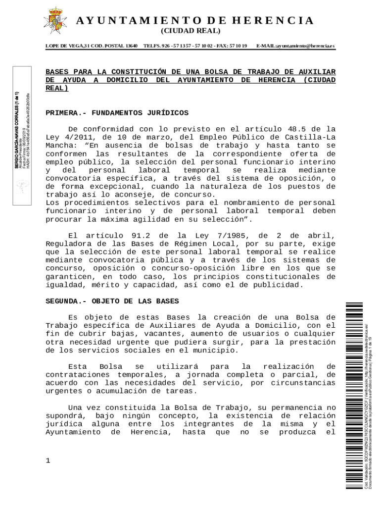 TELLS. 926 57 13 57 57 10 02 FAX: 57 10 19EMAIL:ayuntamiento@herencia.bases PARA LA CONSTITUTION DE RNA BALSA DE TRIBAL DE AUXILIARY
