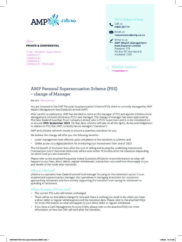 We're happy to help Call us: 0800 267 111 Email us: investments@amp.co.nz Date PRIVATE & CONFIDENTIAL Title Initial/s Last Name Address 1 Address 2 Address 3 Address 4 PostcodeWrite to us: AMP Wealth