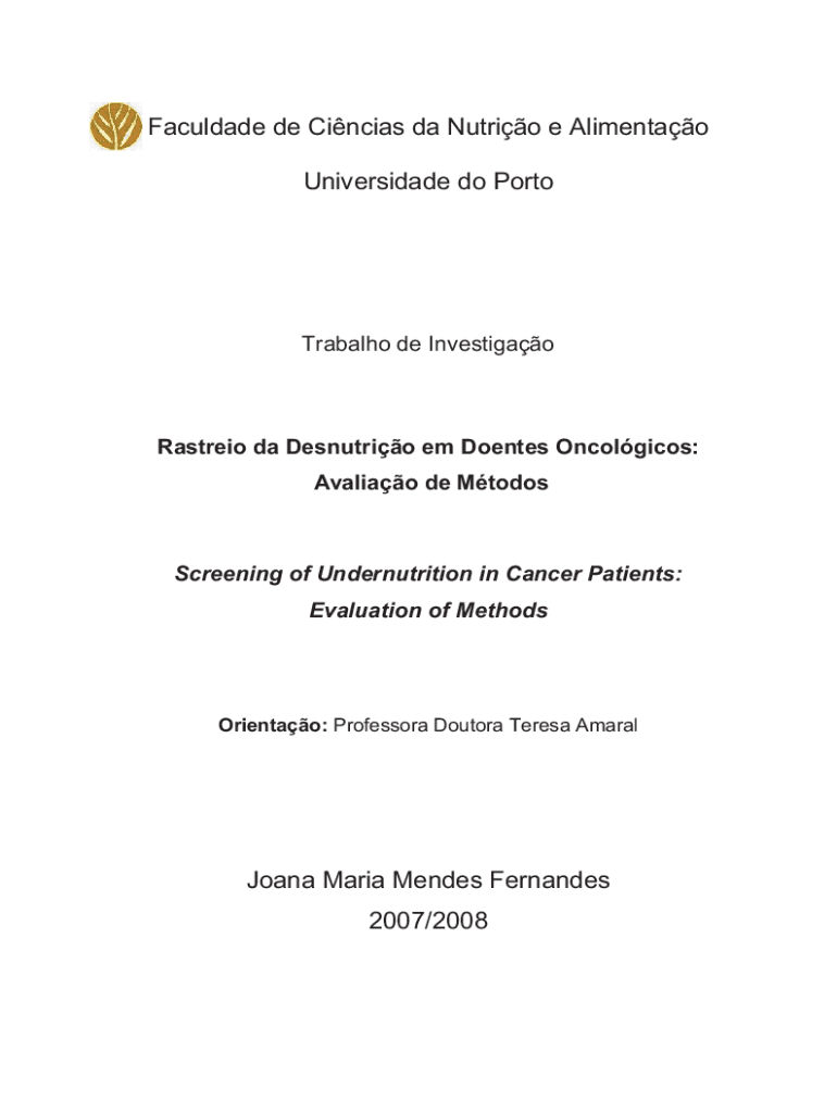 Facade de Cincias the Nutria e Alimentary Universidade do PortoTrabalho de InvestigaoRastreio the Desnutrio em Denotes Oncologists: Amalia de MtodosScreening of Undernutrition in Cancer Patients: