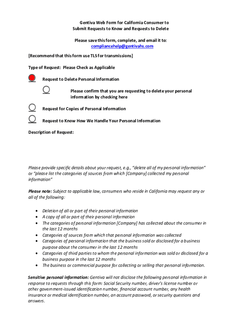 Geneva Web Form for California Consumer to Submit Requests to Know and Requests to Delete Please save this form, complete, and email it to: compliancehelp@gentivahs.com [Recommend that this form use