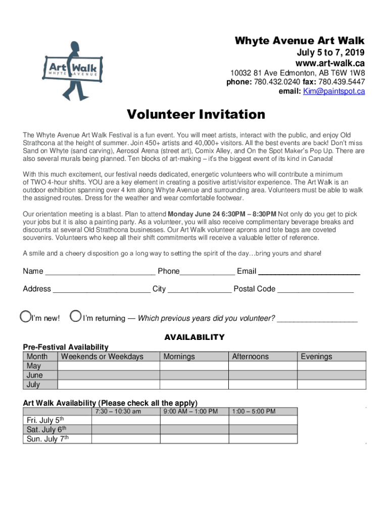 Whyte Avenue Art Walk July 5 to 7, 2019 www.artwalk.ca 10032 81 Ave Edmonton, AB T6W 1W8 phone: 780.432.0240 fax: 780.439.5447 email: Kim@paintspot.caVolunteer Invitation The Whyte Avenue Art Walk