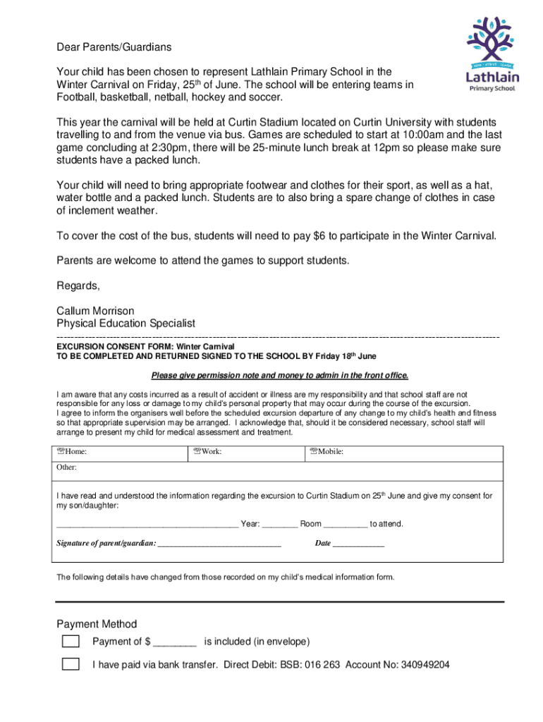 Dear Parents/Guardians Your child has been chosen to represent Lath lain Primary School in the Winter Carnival on Friday, 25th of June. The school will be entering teams in Football, basketball, netball,