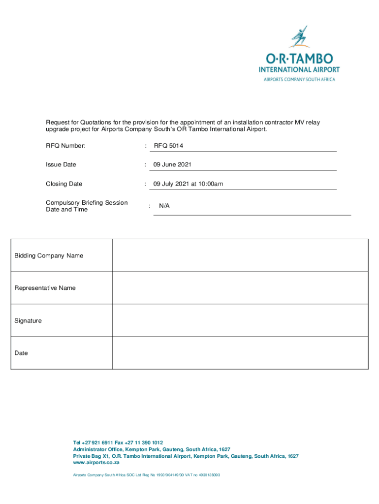 Request for Quotations for the provision for the appointment of an installation contractor MV relay upgrade project for Airports Company Souths OR Tambo International Airport. RFQ Number::RFQ 5014Issue