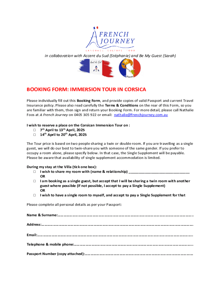 In collaboration with Accent Du SUD (Stephanie) and Be My Guest (Sarah)BOOKING FORM: IMMERSION TOUR IN CORSICA Please individually fill out this Booking Form, and provide copies of valid Passport