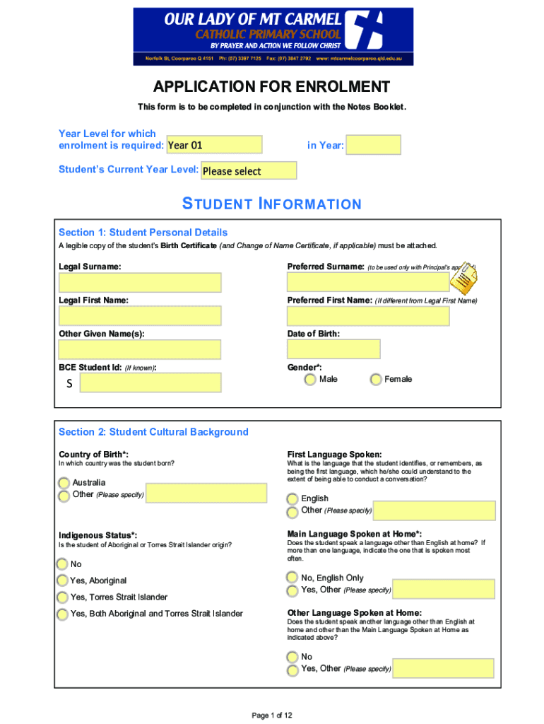 APPLICATION FOR Enrollment This form is to be completed in conjunction with the Notes Booklet. Year Level for which enrollment is required: Year 01in Year:Students Current Year Level: Please select