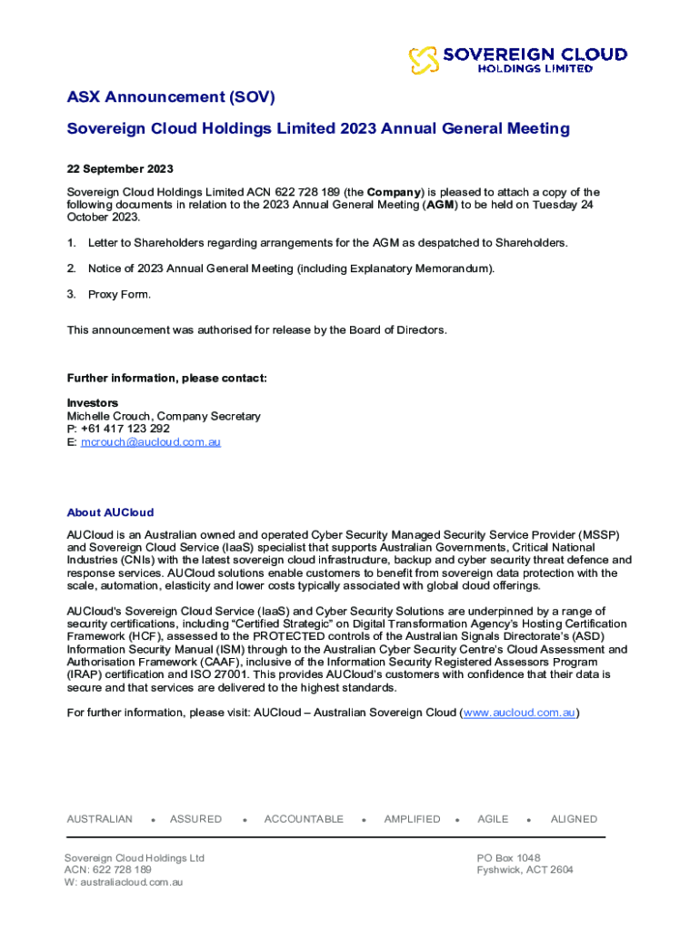 ASX Announcement (SO) Sovereign Cloud Holdings Limited 2023 Annual General Meeting 22 September 2023 Sovereign Cloud Holdings Limited ACN 622 728 189 (the Company) is pleased to attach a copy of the