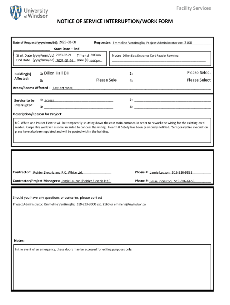 Facility ServicesNOTICE OF SERVICE INTERRUPTION/WORK Format of Request (YYY/mm/dd): 20230208___Requester: ___