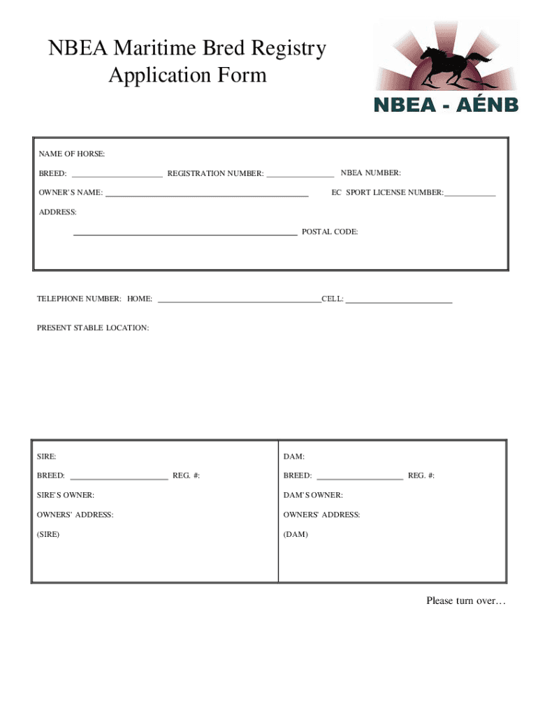 NEA Maritime Bred Registry Application Forename OF HORSE: BREED:NEA NUMBER:REGISTRATION NUMBER:EC SPORT LICENSE NUMBER:___OWNER\' S NAME: ADDRESS:POSTAL CODE:CELL: ___TELEPHONE NUMBER: HOME:PRESENT