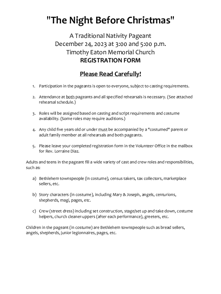 \"The Night Before Christmas\" A Traditional Nativity Pageant December 24, 2023 at 3:00 and 5:00 p.m. Timothy Eaton Memorial Church REGISTRATION FORM Please Read Carefully! 1. Participation in the