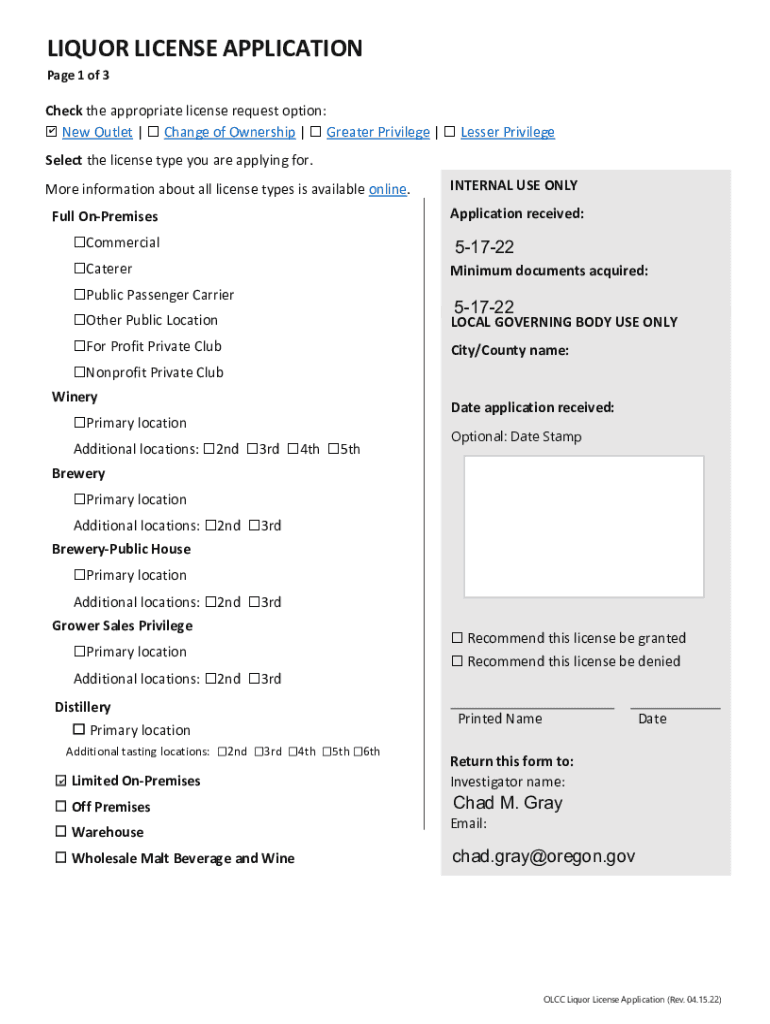 LIQUOR LICENSE APPLICATION Page 1 of 3Check the appropriate license request option: New Outlet | Change of Ownership | Greater Privilege | Lesser Privilege Select the license type you are applying
