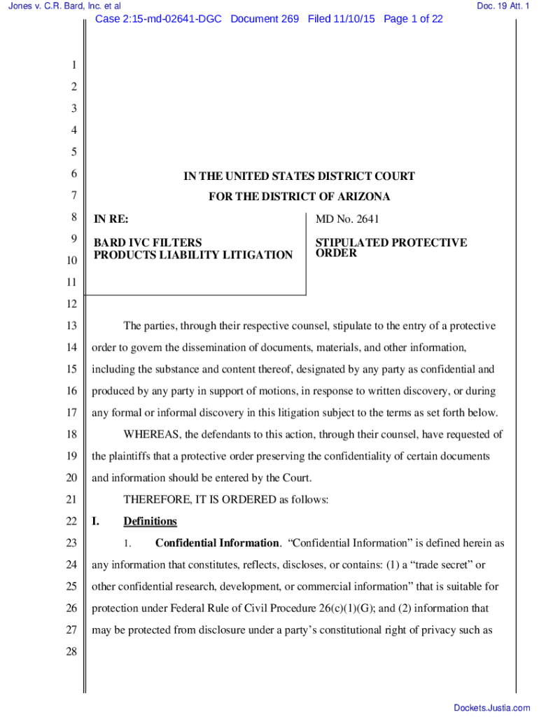 Jones v. C.R. Bard, Inc. et Aldo. 19 ATT. 1Case 2:15md02641DGC Document 269 Filed 11/10/15-Page 1 of 221 2 3 4 5 6IN THE UNITED STATES DISTRICT COURT7FOR THE DISTRICT OF ARIZONA8IN RE:MD No. 26419BARD