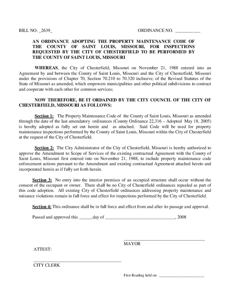 BILL NO. _2639_ORDINANCE NO. ___AN ORDINANCE ADOPTING THE PROPERTY MAINTENANCE CODE OF THE COUNTY OF SAINT LOUIS, MISSOURI, FOR INSPECTIONS REQUESTED BY THE CITY OF CHESTERFIELD TO BE PERFORMED BY