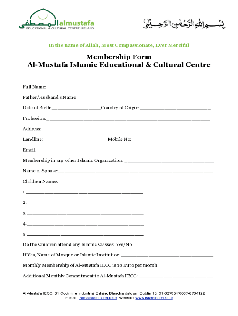 In the name of Allah, Most Compassionate, Ever MercifulMembership FormAlMustafa Islamic Educational & Cultural Centre Full Name:___ Father/Husbands Name: ___ Date of Birth:___Country of Origin:___