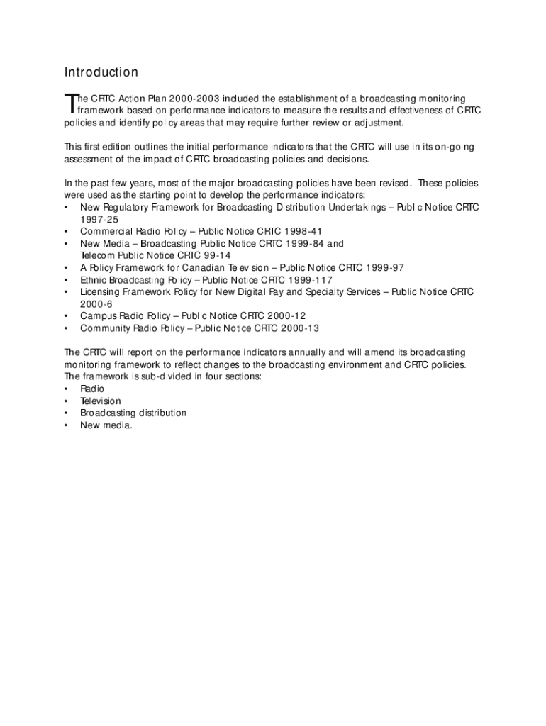 IntroductionThe CRTC Action Plan 20002003 included the establishment of a broadcasting monitoring framework based on performance indicators to measure the results and effectiveness of CRTC policies
