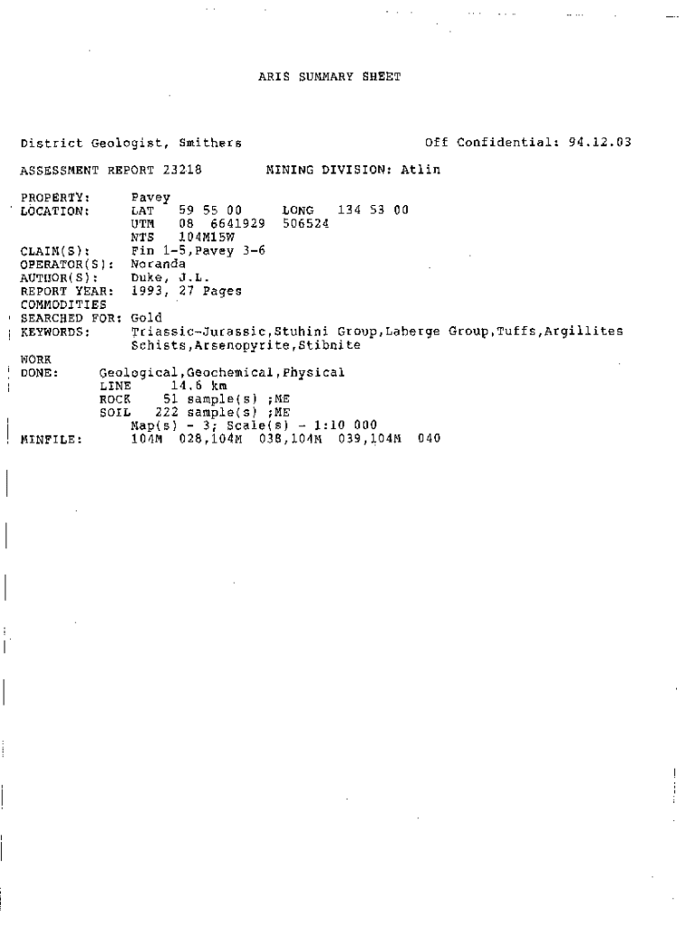 ARIS SUMMARY SHEETDistrict Geologist, Smithers ASSESSMENT REPORT 23218 PROPERTY: LOCATION :Off Confidential: 94.12.03 MINING DIVISION: AtlinPavey LAT 59 55 00 UTM 08 6641929 NTS 104M15W Fin 15,Pavey