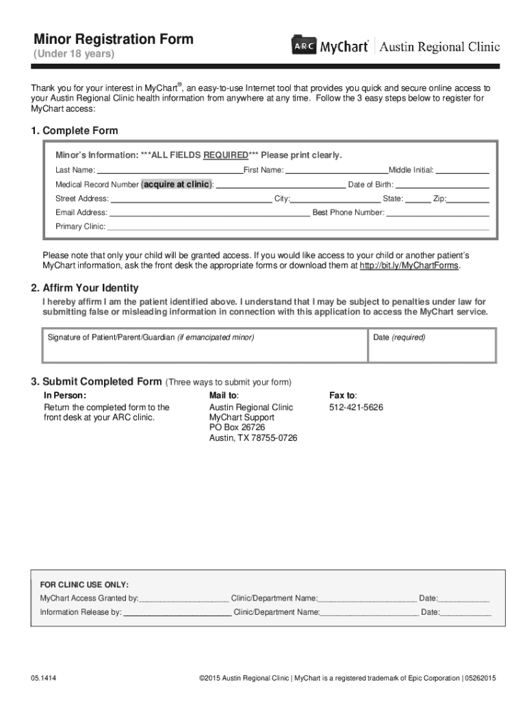 The Minor Registration Form can be filled out by parents or legal guardians of minors under the age of 18 who are seeking access to MyChart services at the Austin Regional Clinic.