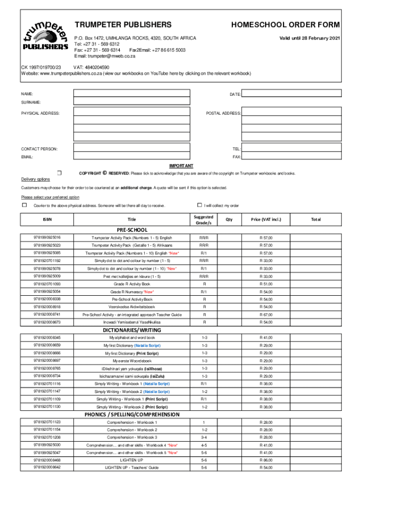 HOMESCHOOL ORDER FORMTRUMPETER PUBLISHERSValid until 28 February 2021P. O. Box 1472, MELANGE ROCKS, 4320, SOUTH AFRICA