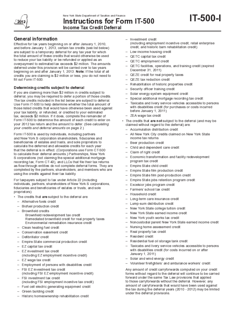New York State Department of Taxation and FinanceInstructions for Form IT500 Income Tax Credit Deferral General informationEffective for tax years beginning on or after January 1, 2010, and before