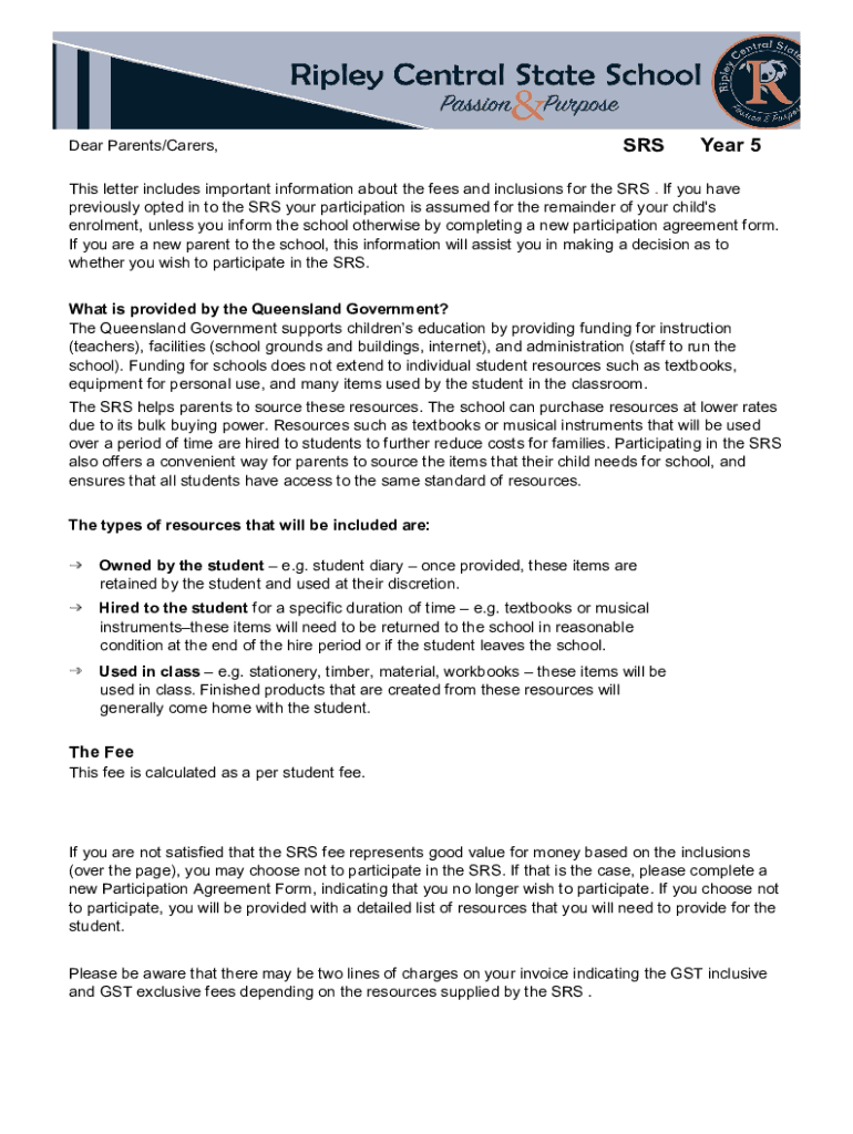 Dear Parents/Carers,SRSYear 5This letter includes important information about the fees and inclusions for the SRS . If you have previously opted in to the SRS your participation is assumed for the