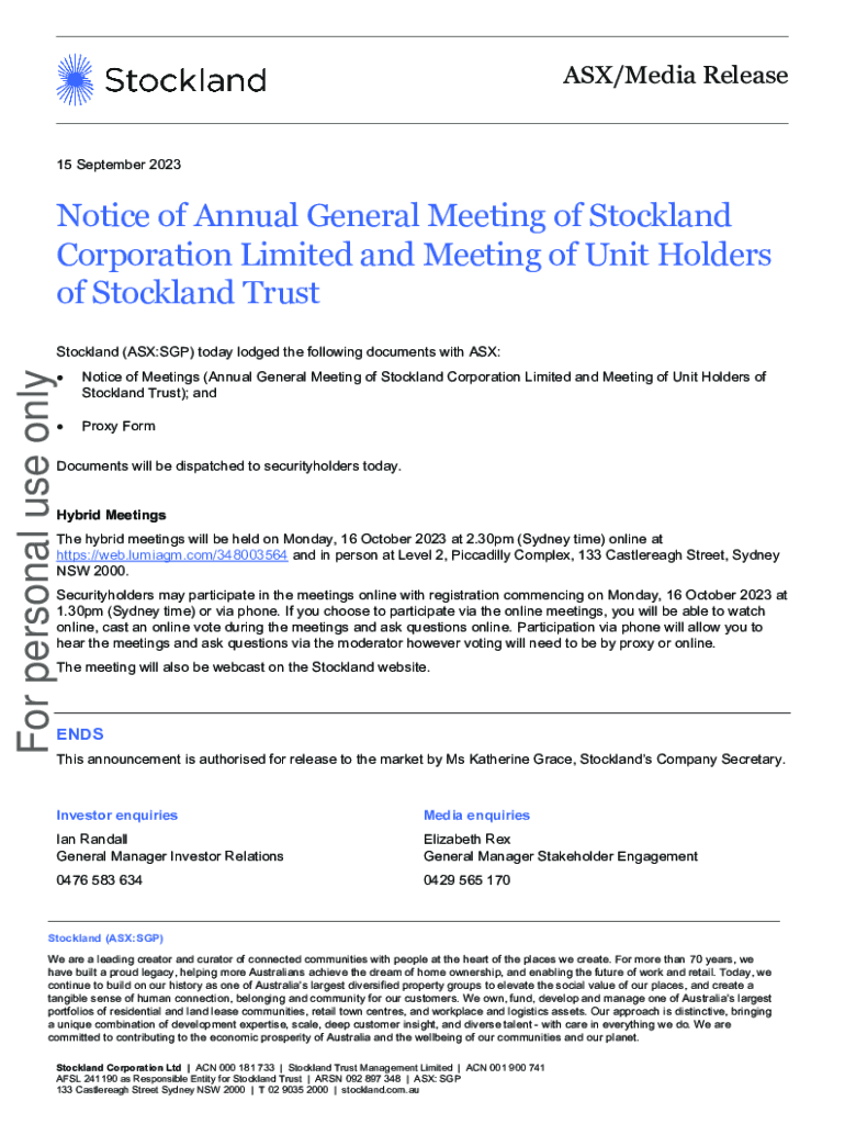 ASX/Media Release15 September 2023Notice of Annual General Meeting of Stock land