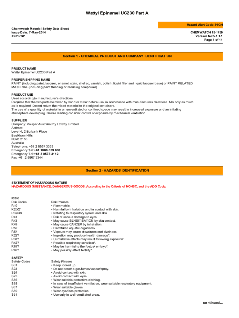 Wattyl Epinamel UC230 Part A Hazard Alert Code: HIGH Chemwatch Material Safety Data Sheet Issue Date: 7May2014 X9317SPCHEMWATCH 151759 Version No:5.1.1.1 Page 1 of 11Section 1 CHEMICAL PRODUCT AND