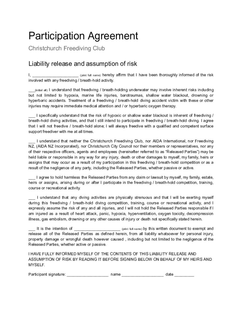 Participation Agreement Christchurch Freediving ClubLiability release and assumption of risk I, ___ (print full name) hereby affirm that I have been thoroughly informed of the risk involved with any