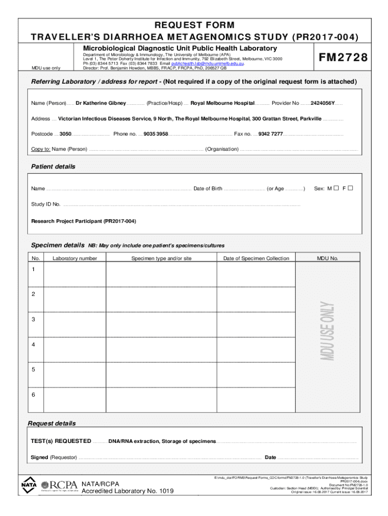 REQUEST FORM Travelers Diarrhea REAGANOMICS STUDY (PR2017004) Microbiological Diagnostic Unit Public Health Laboratory Department of Microbiology & Immunology, The University of Melbourne (APA) Level