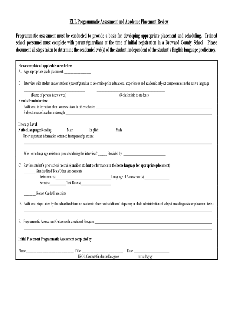 ELL Programmatic Assessment and Academic Placement Review Programmatic assessment must be conducted to provide a basis for developing appropriate placement and scheduling. Trained school personnel