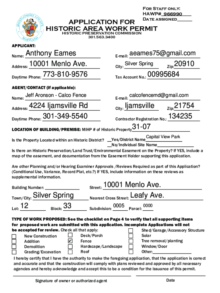 For Staff only: HAWP#___ 966990 Date assigned___APPLICATION FOR HISTORIC AREA WORK PERMIT HISTORIC PRESERVATION COMMISSION 301.563.3400APPLICANT:Anthony Eames 10001 Menlo Ave. Address: ___ 7738109576