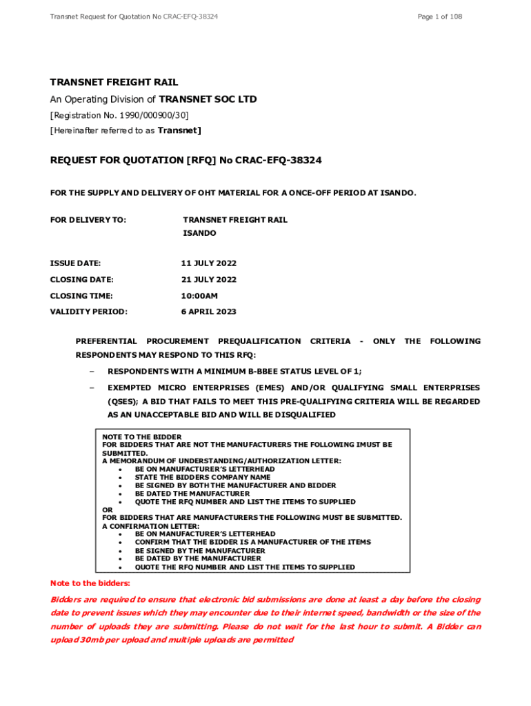 Transnet Request for Quotation No CRACEFQ38324Page 1 of 108TRANSNET FREIGHT RAIL An Operating Division of TRANSNET SOC LTD [Registration No. 1990/000900/30] [Hereinafter referred to as Transnet]REQUEST
