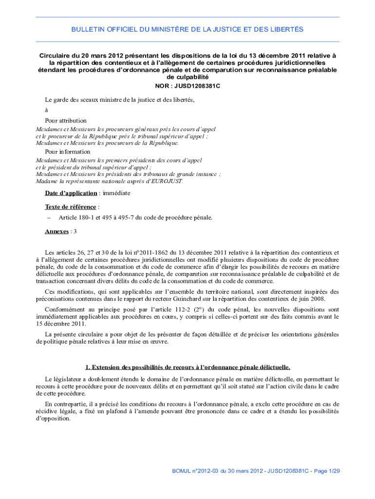 BULLETIN OFFICIAL DU MINISTRY DE LA JUSTICE ET DES LIBERTSCirculaire Du 20 Mars 2012 pregnant LES dispositions DE la LOI Du 13 December 2011 relative
