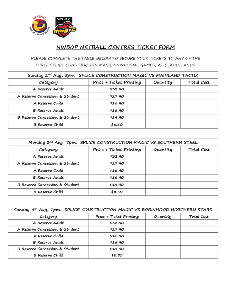 NW BOP NETBALL Centers TICKET FORM PLEASE COMPLETE THE TABLE BELOW TO SECURE YOUR TICKETS TO ANY OF THE THREE SPLICE CONSTRUCTION MAGIC 2020 HOME GAMES, AT CLAUDELANDS. Sunday 2nd Aug, 5pm. SPLICE