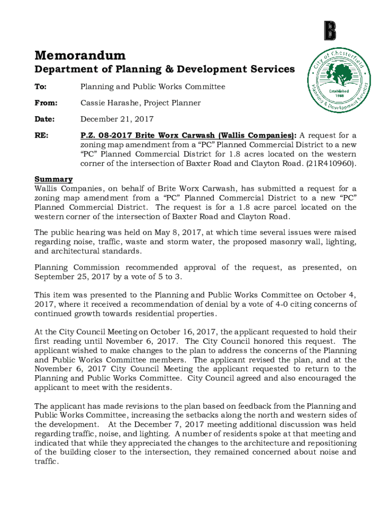 B Memorandum Department of Planning & Development Services To:Planning and Public Works CommitteeFrom:Cassie Hara she, Project PlannerDate:December 21, 2017RE:P.Z. 082017 Write Work Car wash (Wallis