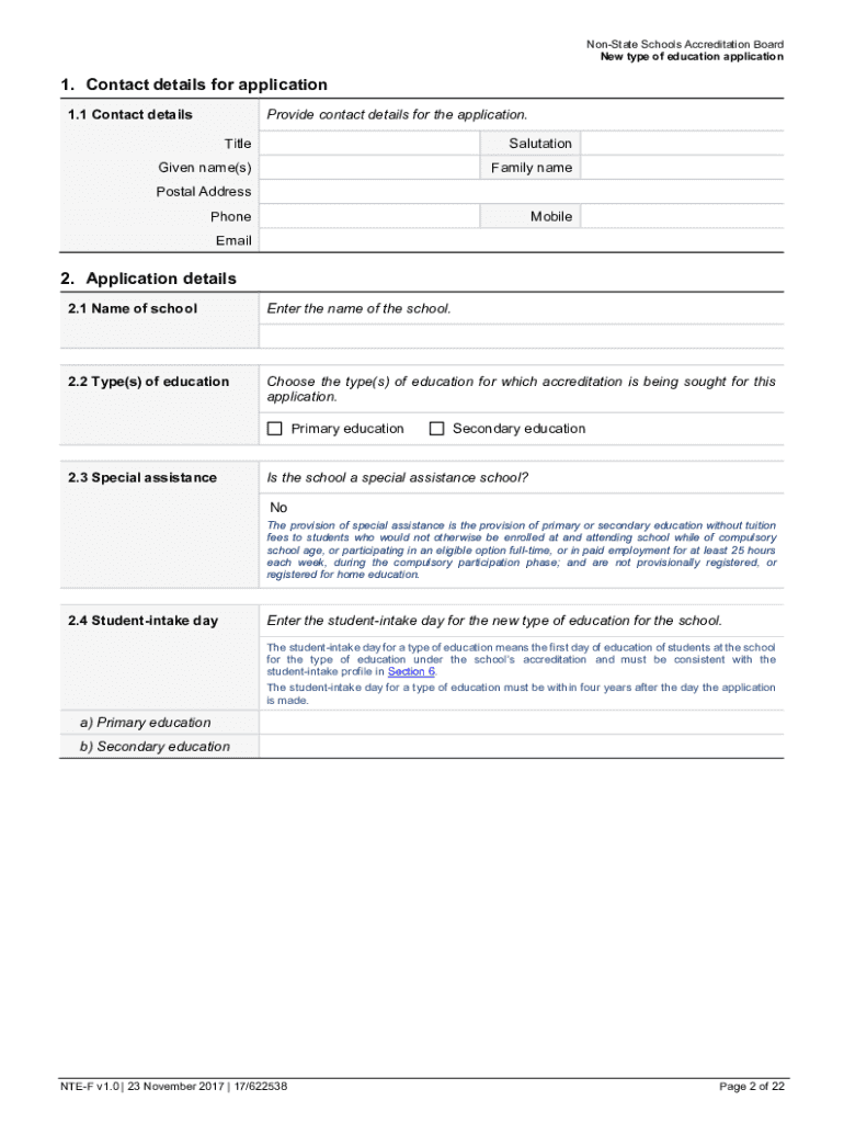 NonState Schools Accreditation Board New type of education application Education (Accreditation of NonState Schools) Act 2017 Section 19 Form NTEF Legislative background The Education (Accreditation