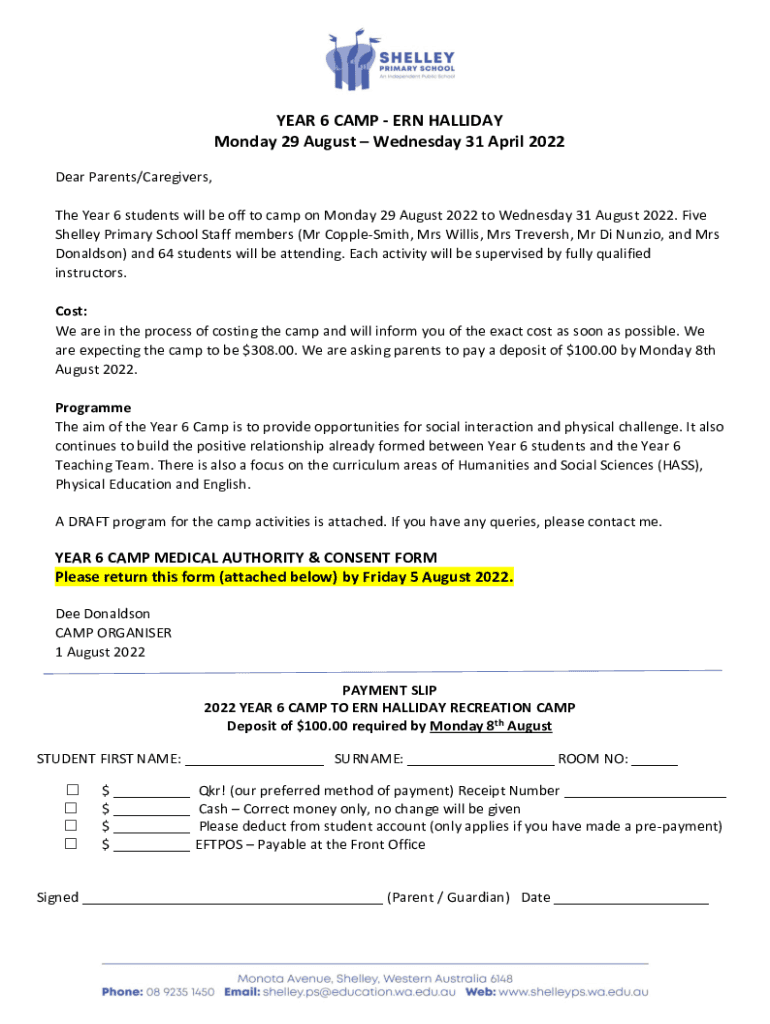Get the free YEAR 6 CAMP - ERN HALLIDAY Monday 29 August - shelleyps wa edu