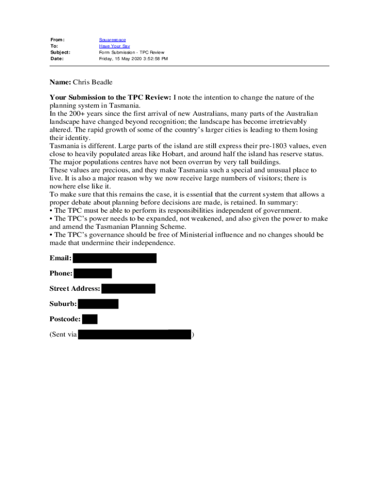 From: To: Subject: Date:Squarespace Have Your Say Form Submission TPC Review Friday, 15 May 2020 3:52:58 Name: Chris Beadle Your Submission to the TPC Review: I note the intention to change the nature