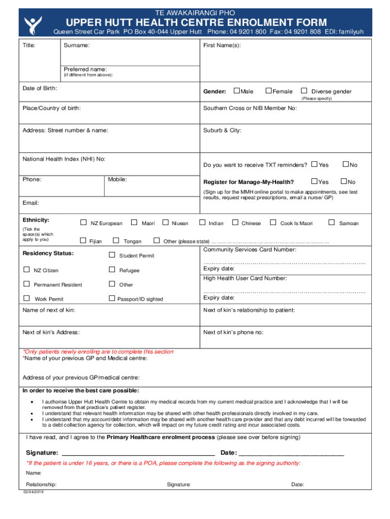 TE AWAKAIRANGI HOPPER HUNT HEALTH Center Enrollment FORM