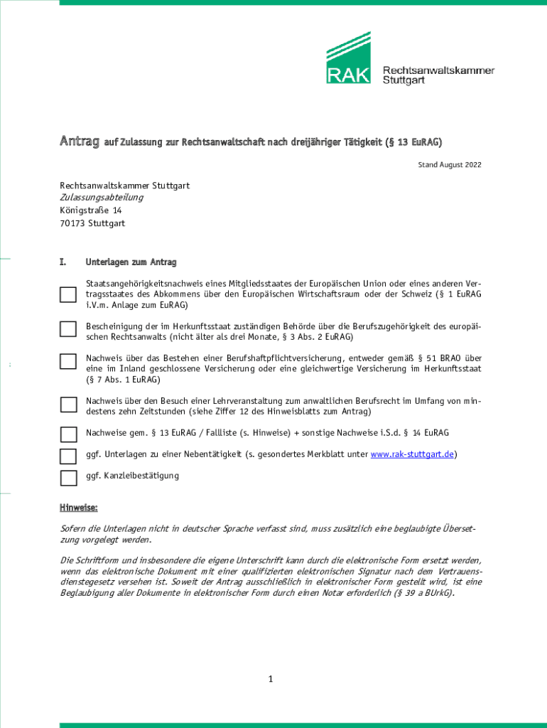 Stand August 2022Rechtsanwaltskammer StuttgartZulassungsabteilung