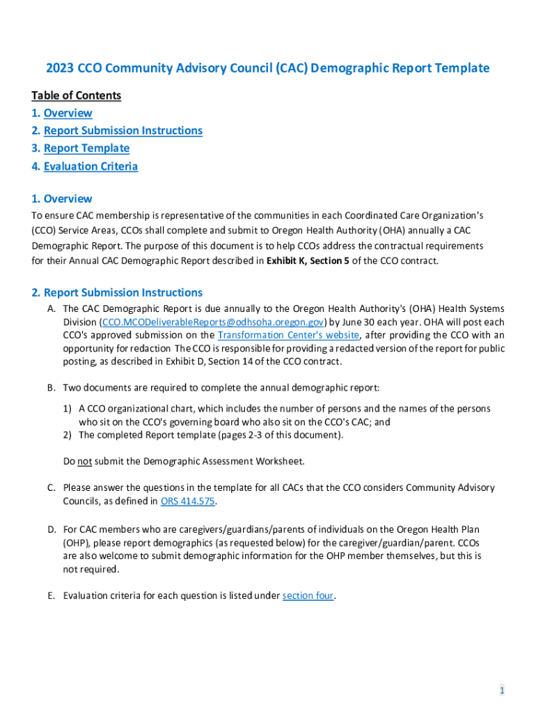 2023 CCO Community Advisory Council (CAC) Demographic Report Template Table of Contents 1. Overview 2. Report Submission Instructions 3. Report Template 4. Evaluation Criteria 1. Overview To ensure