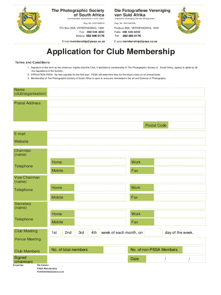 The Photographic Society of South Africa (Incorporated Association not for Gain) Reg. No. 54/01845/08PO Box 868, VEREENIGING, 1930 Fax: 086 546 4230 Mobile: 082 846 0176 Email membership@pssa.co.zaDie