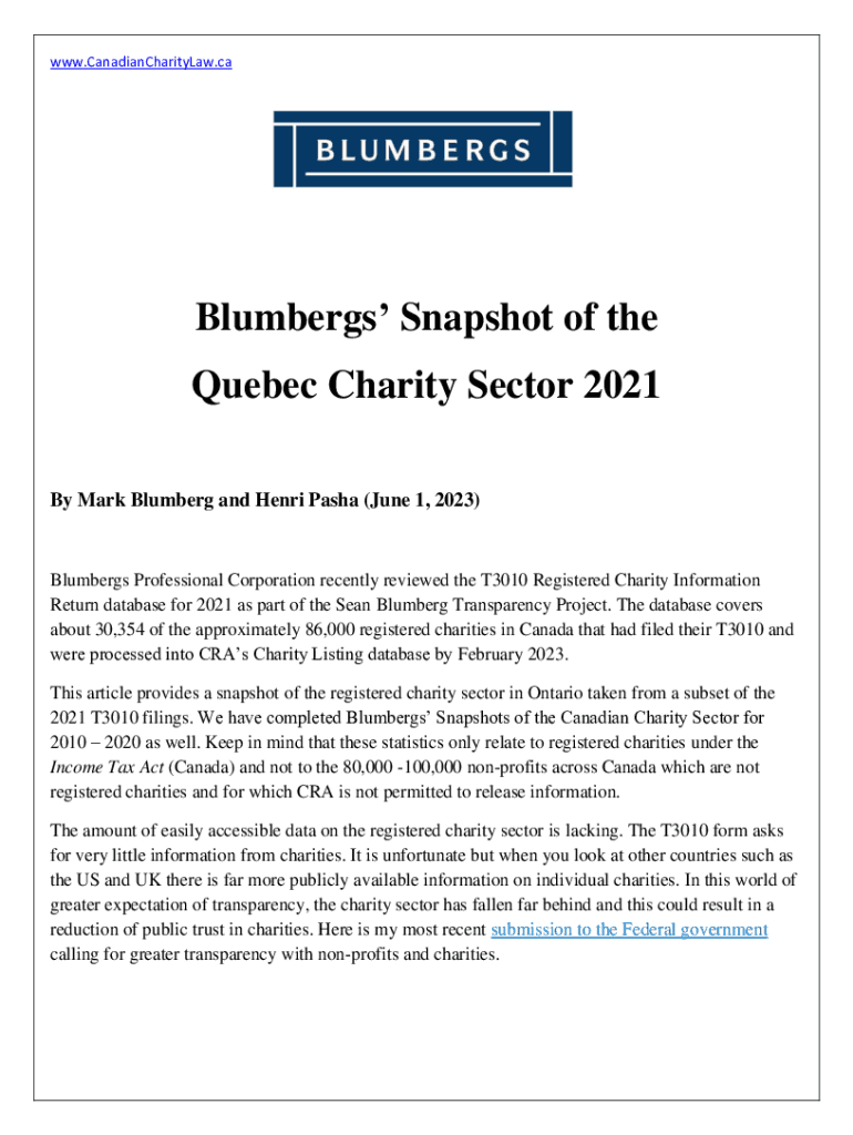 WWW. CanadianCharityLaw.caBlumbergs Snapshot of the Quebec Charity Sector 2021 By Mark Lumber and Henri Pasha (June 1, 2023)Plumbers Professional Corporation recently reviewed the T3010 Registered