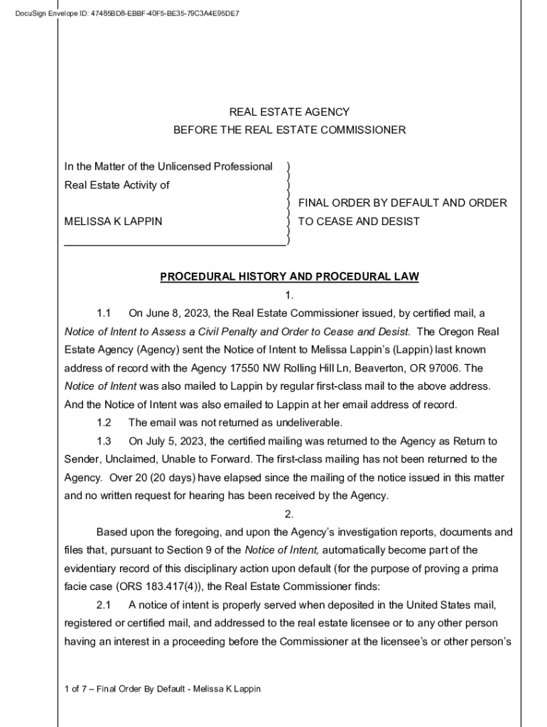 DocuSign Envelope ID: 47485BD8EBBF40F5BE3579C3A4E95DE7REAL ESTATE AGENCY BEFORE THE REAL ESTATE COMMISSIONER In the Matter of the Unlicensed Professional Real Estate Activity of MELISSA K LAPPING))