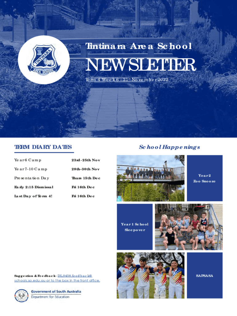 Term 4 Week 6 21st November 2022TERM DIARY Interschool HappeningsYear 6 Camp23rd25th Nowhere 710 Camp28th30th Nov Thurs 15th Representation Yearly 2:15 Dismissal Fri