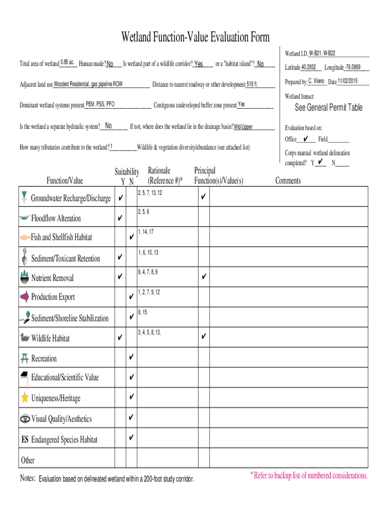 Wetland Functional Evaluation Form WB21, WB22 Wetland I.D.___0.85 ac. Human made?___ Total area of wetland___ Is wetland part of a wildlife corridor?___ or a \”habitat island\”?___ No No Yes40.2932