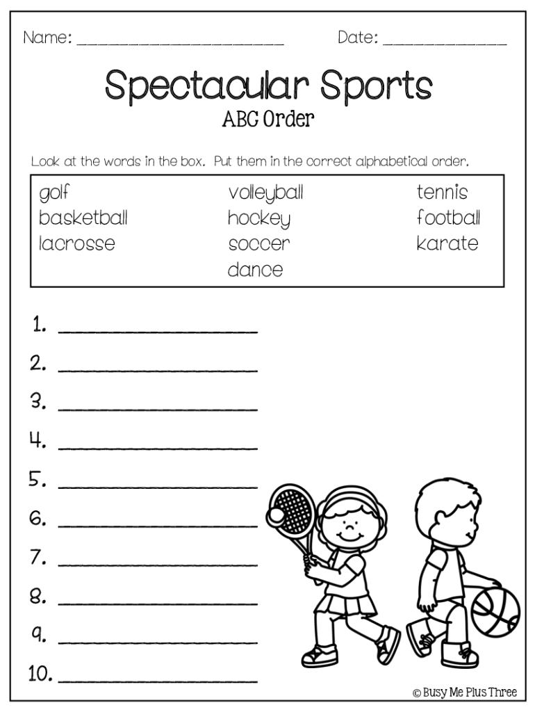 Name: ___Date: ___Spectacular Sports ABC Overlook at the words in the box. Put them in the correct alphabetical order. Golf basketball lacrosse volleyball hockey soccer dance tennis football karate1.