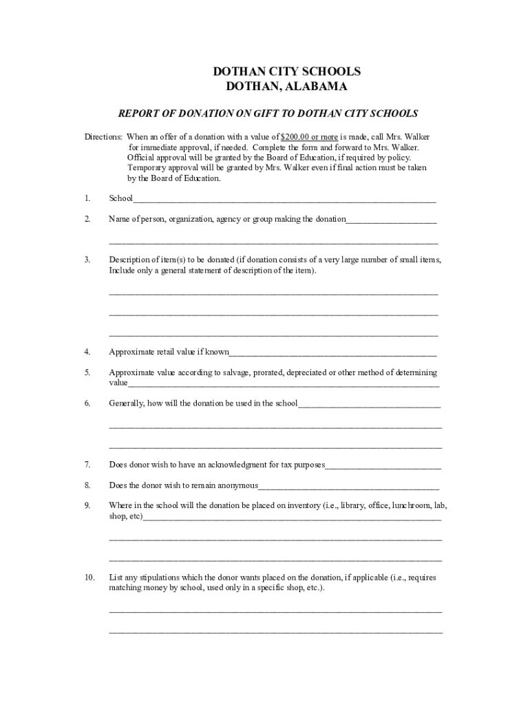 DOTHAN CITY SCHOOLS DOTHAN, ALABAMA REPORT OF DONATION ON GIFT TO DOTHAN CITY SCHOOLS Directions: When an offer of a donation with a value of $200.00 or more is made, call Mrs. Walker for immediate