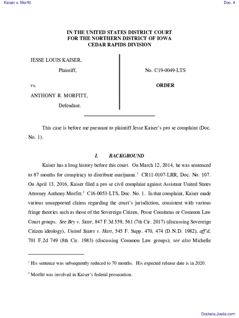 Kaiser v. MorfittDoc. 4IN THE UNITED STATES DISTRICT COURT FOR THE NORTHERN DISTRICT OF IOWA CEDAR RAPIDS DIVISION JESSE LOUIS KAISER, Plaintiff,No. C190049LTSvs.ORDERANTHONY R. MORFITT, Defendant.